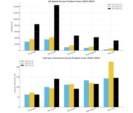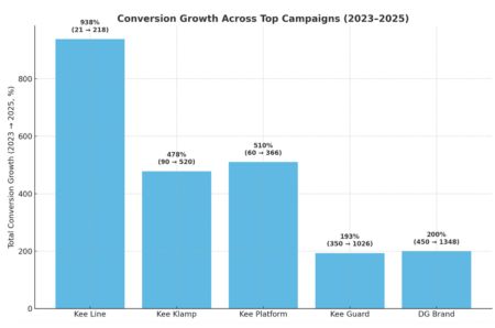 - Campaign Expansion: Grew from a handful of core campaigns in 2022 into a comprehensive portfolio covering dozens of product lines and strategies (Brand, Guard, Klamp, Platform, Line, Retargeting, Competitor, and more).