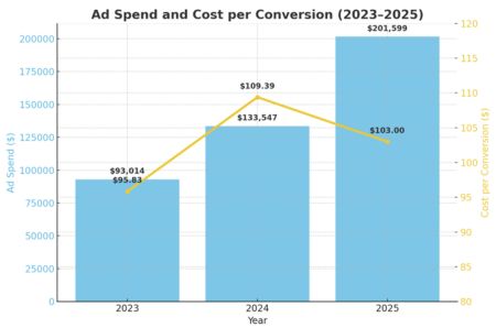 - Despite increasing Google Ads spend by 116% over three years, from $93,014 in 2023 to $201,599 in 2025, we managed to keep our cost per conversion stable (~$103) across campaigns, showing that growth didn’t come at the expense of efficiency.