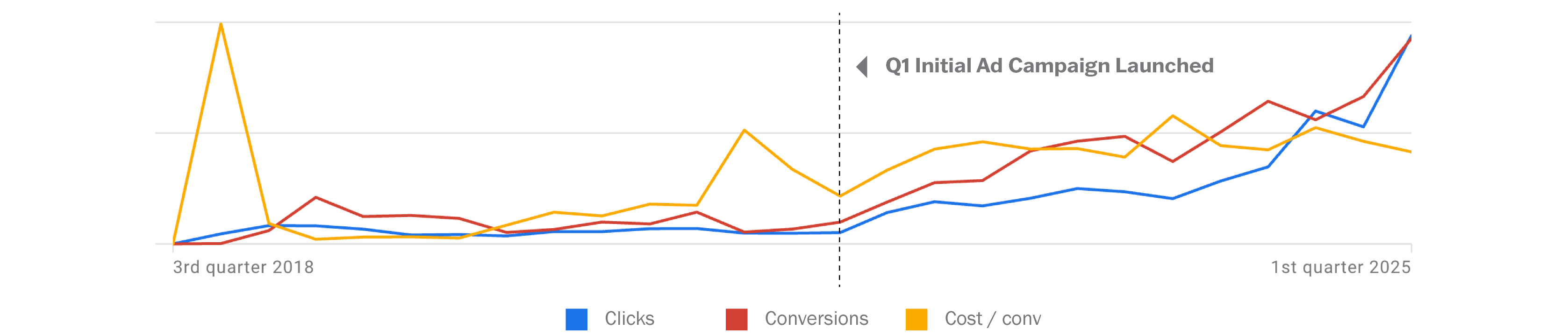 Since implementing a structured Google Ads strategy in early 2022, PPC has become one of the most reliable drivers of growth for Kee Safety. Quarterly conversions increased by more than 400%, rising from an average of just over 50 per quarter before 2022 to more than 270 per quarter in the years following. Total conversions surged from 724 pre-2022 to over 3,500 in the three years since, while maintaining a cost-per-conversion increase of only about 8% per year. This balance of scale and efficiency reflects not only higher visibility, but also smarter allocation of budget and resources—proving the long-term value of PPC as a core growth channel.